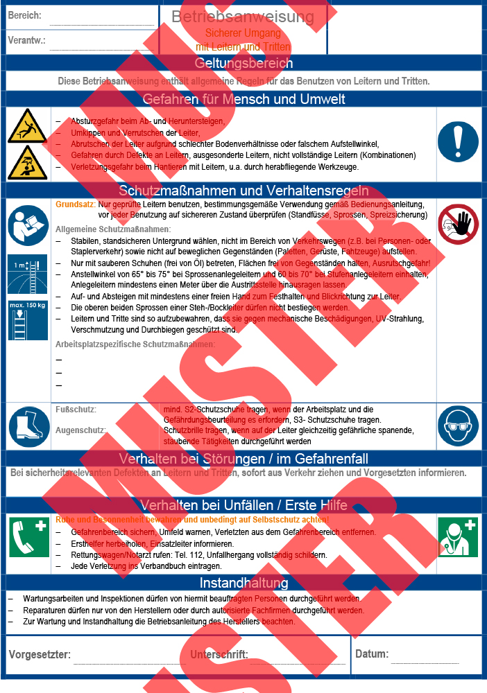 Diese ausfüllbare Betriebsanweisung ist für die korrekte Handhabung von Leitern und Tritte ausgelegt. Helfen auch Sie, Absturzunfälle zu vermeiden. Unterweisen Sie Ihre Mitarbeiter mit dieser Betriebsanweisung im korrekten Umgang mit Leitern und Tritten. Die Betriebsanweisung liegt als Download-Produkt vor.